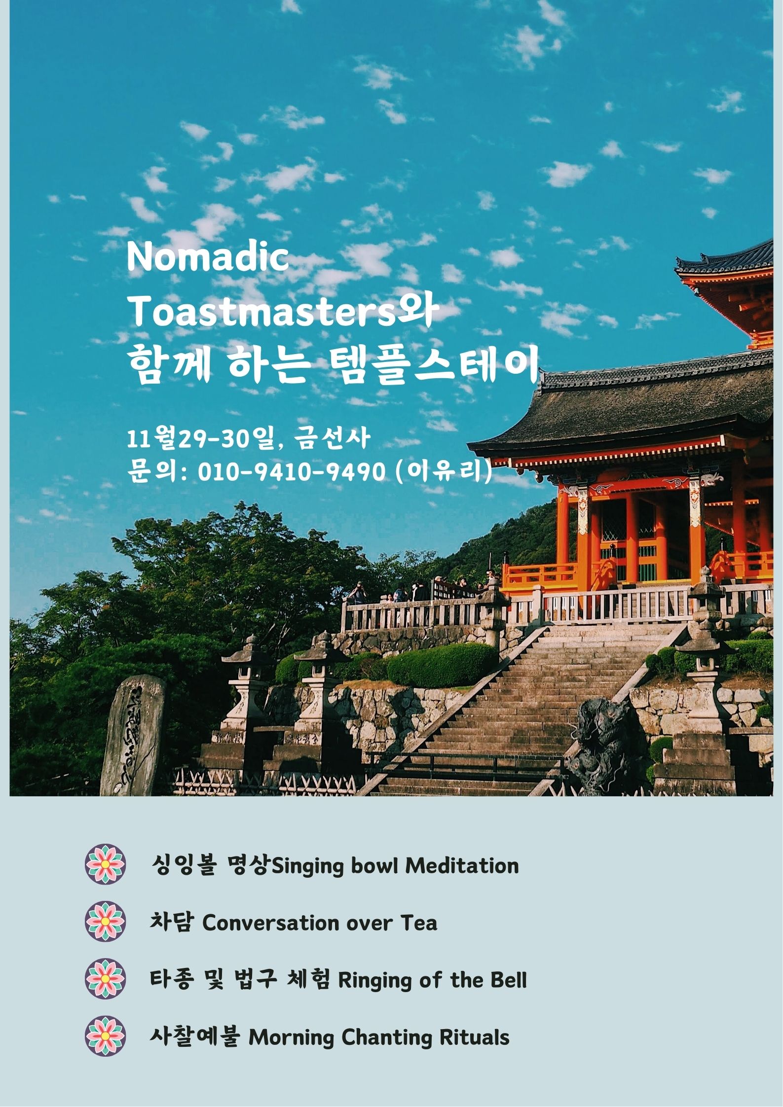 Nomadic Toastmasters is going on a temple stay! This is your chance to enjoy the cool autumn air and relax both mind and body. There is 1 spot currently available. Please contact me for any information.