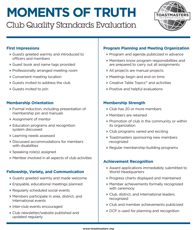 First Impressions / Membership Orientation / Fellowship, Variety, and Communication / Program Planning and Meeting Organization / Membership Strength / Achievement Recognition